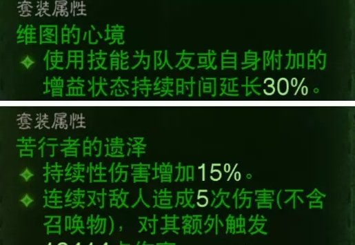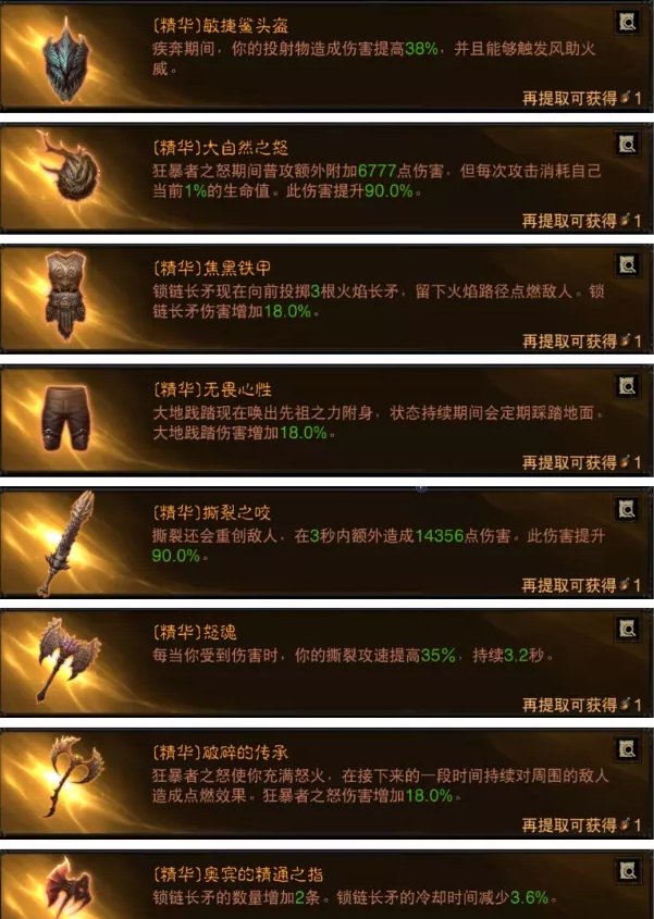 狂暴者之怒带点燃不用多说,虽然没有风火流触发,但是全程点燃搭配4苦行2魔眼等套装都是极为实用的。值得一提的是护肩我们选择了大自然之怒,每次攻击会掉血,这刚好和撕裂主手联动起来。