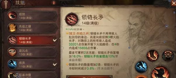 这套玩法拥有极高的爆发能力,核心锁链长矛弥补了野蛮人缺少AOE远程的短板,普攻伤害是打单体的主要手段,在BD中我们选择了撕裂其次副手破碎传承的全程点燃,注意这套BD锁链长矛是唯一的风火助威技能。