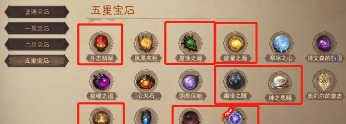 5星宝石推荐伤害类斗志、腐蚀、幽暗、能量、星火、虚空6大输出宝石拉满,防御类宝石选择收益最高的夜影之护+神恩(神恩偏向PVE,偏PVP推荐带寒冰之心)
