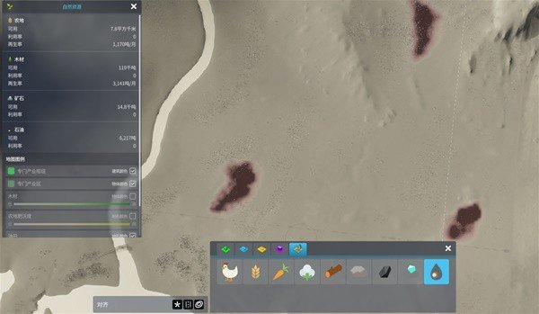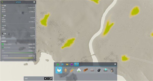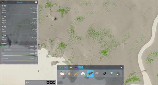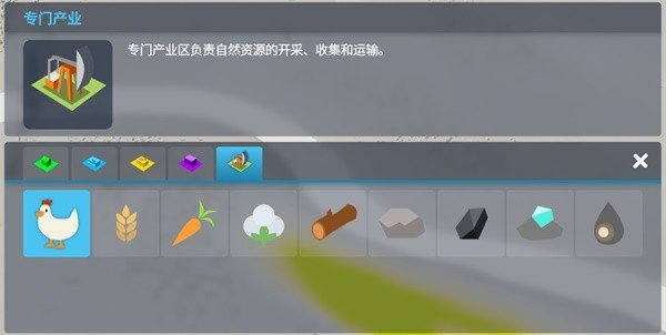 畜牧养殖,谷物种植,蔬菜种植,纺织纤维种植,都需要在地图中的绿色区域放置才能够提供资源。