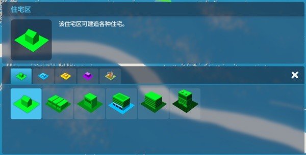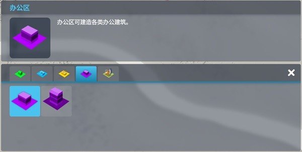 区域划分共分为5个部分包括住宅区、商业区、工业区、办公区和专门产业。分别为城市提供住宅,商业,工业,办公场所以及基础资源。