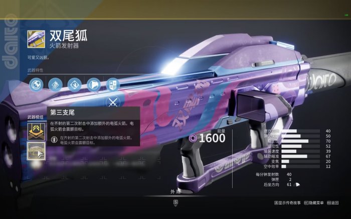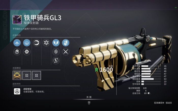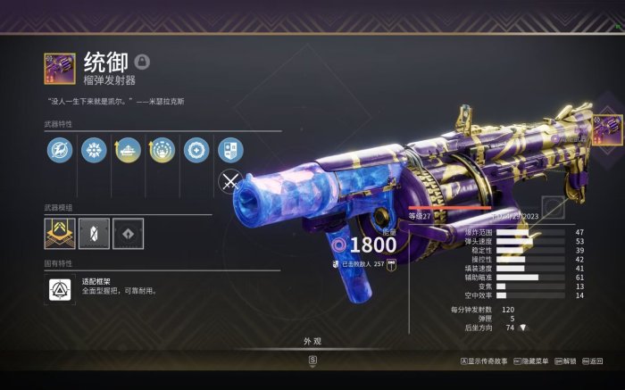 统御;抗战赛季榴弹;获取方式为战争圆桌处兑换;自填+爆炸光能perk的统御主要还是其他武器配合速切。嫉妒刺客+级联点的铁甲骑兵拥有榴弹第二的dps,这把算是铁甲骑兵的下位替代