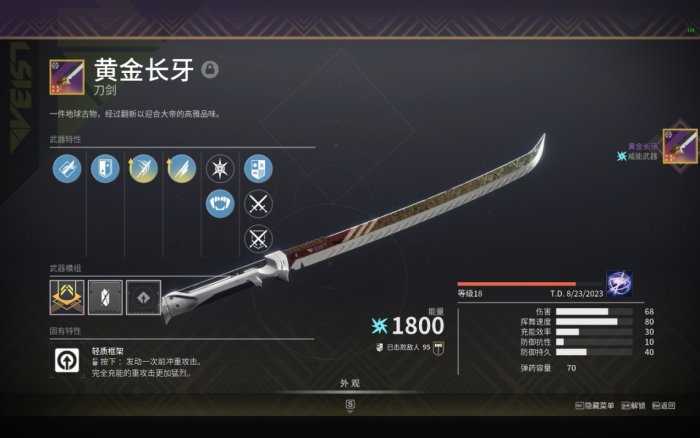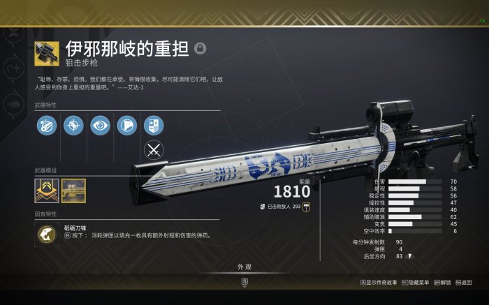 伊邪那岐的重担,大家口中的剑狙,已经随着版本更迭逐渐淡出大众的视野。但是在远距离上如国王的陨落尾王还是有拿出来用的机会,但是也仅仅是有机会,其他优秀武器也很多,不必执着于剑狙。放在这里算是情怀推荐。