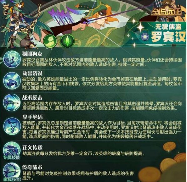 2、劫富济贫 被动:敌方英雄能量溢出的一定比例将转化为金币掉落在地面上。罗宾汉释放主动技能会收集场上的所有金币和钱袋并发放给队友,使其回复能量。
