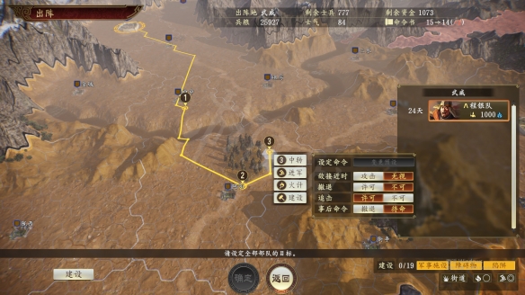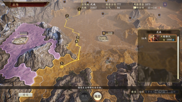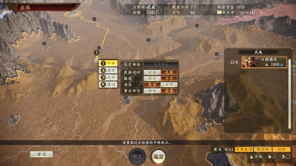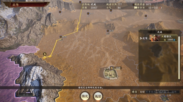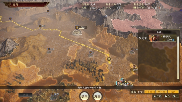 第四旬,董卓第二波兵差不多了,继续断粮干掉,此时韩遂士气训练满了,训练士气的原因怕半路出意外断粮了,而且前三旬韩遂出发也没用。带5000兵出发准备占梓潼。安定那边没什么可操作,闫行断粮,程银打就行。韩遂路线图如下,后续直接拉到梓潼去。