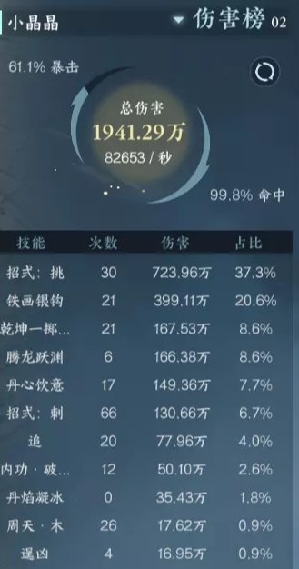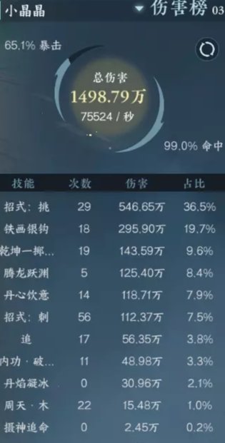 内功我带的是三金三木,所有测试都带的是这一套,因为考虑到三木的技能CD减少,每套装备测试都在三轮以上!