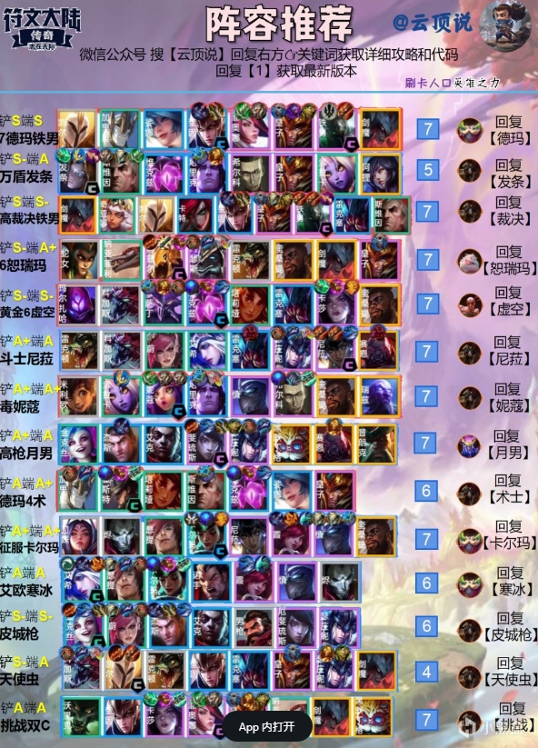 强化符文:必备潘多拉的装备,保证主C主坦的完美三件套。其次法师之徽、法师之心、法师之冕,后续可以开8法师,提升阵容上限。巨神峰之心,开3巨神峰再次提升阵容护盾和治疗效果。参天巨人的坚决,获得一个泰坦,并且可以叠加到40层。灌注,加速阵容的回蓝。珠光莲花,让技能可以暴击,大幅增强阵容输出能力。黄金门票、常客优惠,便于阵容追三星。魔杖,获得一个大棒,并提升全体英雄法强。