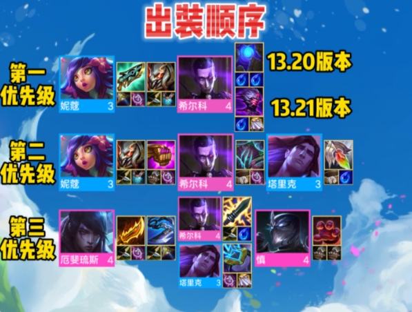 第二优先级:妮蔻第三件(可以继续补泰坦,也可以补个法爆/暗夜收割者,之所以推后面两件装备,是因为这套拳套真不好消化)注意当前版本术士阵容多,防暴毙第三件也可以补龙牙;希尔科的鬼书、塔里克的救赎,后面两件都是腰带+?组成的,两件都很关键,解释就是光靠妮蔻一个肉扛不住,宝石也得补2件,希尔科光有回蓝也不行,也得发挥技能面积大的优势,做个鬼书打打减疗