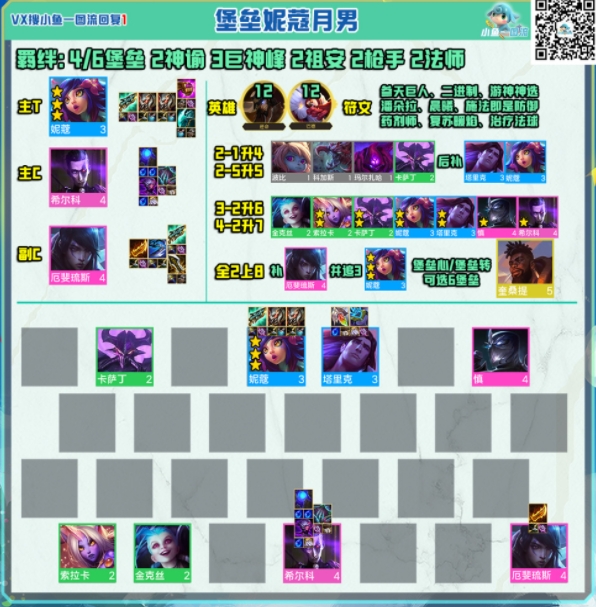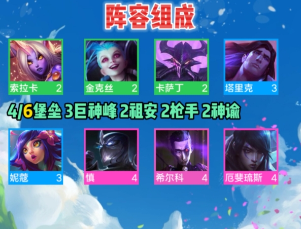 2阶段:留一组低费2星堡垒排,然后看着搭,比如挂2以绪2神谕,比如挂3虚空2斗,后面继续攒堡垒牌,前排慢慢补出4堡垒,后排等希尔科来,注意前期卡经济可以不留索拉卡和金克丝,这套如果重心放在妮蔻宝石希尔科身上,索拉卡多半是没装备吃的(但我看NGA有个云巅59的玩家发了追3奶妈的理解)