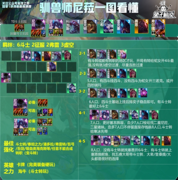 尼菈虽然被削弱了,但如果能开出斗士转有火炮还是很强的,就是成型需求较难,如果没有很多弓的情况下推荐不要尼菈要沙皇C,强度也非常不错