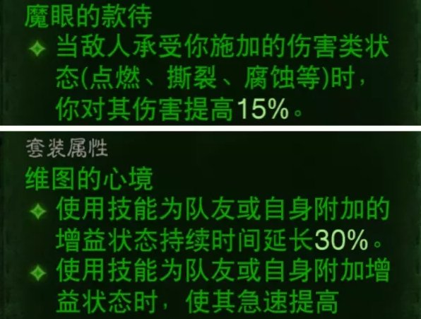 套装推荐4维图2魔眼,虽然维图对于心魔和火力全开领域没有太多加成,但是飞刀和30%的急速依然是猎魔人非常关键的属性。2魔眼搭配飞刀的撕裂效果可以全程覆盖,所以2魔眼是猎魔必带的。
