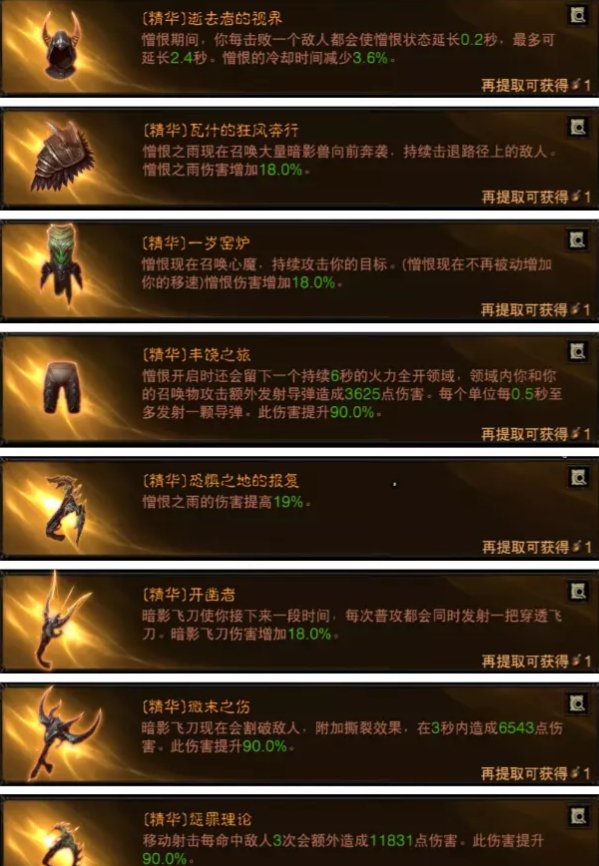 憎恨裤子的效果是火力全开,领域内你和你的召唤物攻击额外发射导弹,这刚好和我们的心魔衣服搭配上。这个领域也是6秒,同样不吃维图增益,所以玩这套思路带维图收益很低。注意这个导弹是有发射上限的,至多0.5秒发射一颗。最后是憎恨头,因为头部没有其他精华选择,带逝去者的视界比较合适。