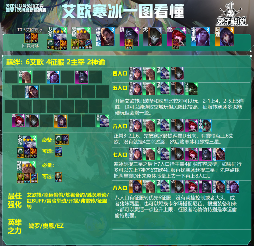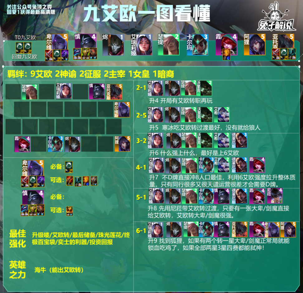有两个艾欧转的对局时候就奔着这套来玩,一般是彩局或者前期大连胜才能玩的,因为前置条件必须上到九人口D到狐狸才能凑齐9艾欧,但因为现在9艾欧加强了,所以现在开出9艾欧全一星都能锁血了