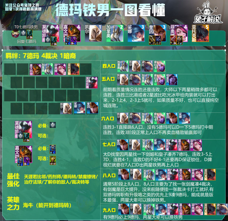 现在版本最强最好的单转职羁绊,因为德玛阵容对装备需求会减低很多,而且成型后也强于各种6羁绊阵容,属于这版本开到就轻松吃分的转,同时9德胜率也是全9羁绊里最高的!