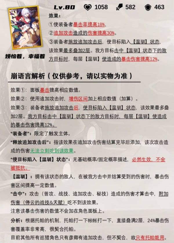 根据托帕的机制,托帕打一下帐帐打一下,直接叠满2层,24%暴击伤害覆盖率非常高,很契合托帕。目前其他所有巡猎角色只有彦卿有追加攻击,但不契合,故只有托帕能用。