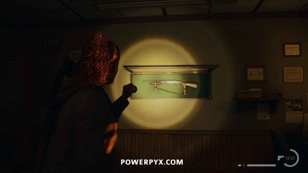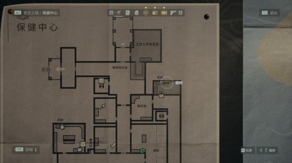 在保健中心内。到达保安室后,输入密码170823进入电脑并打开大门。先在往北边进入工作人员休息室,打开接诊台后面的一个箱子,然后返回保安室,打开保安室右边的门即可找到猎枪。