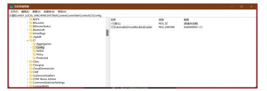 那么你需要到注册表里的这个目录下HKEY_LOCAL_MACHINESYSTEMCurrentControlSetControlCIConfig把这个VulnerableDriverBlocklistEnable改成1
