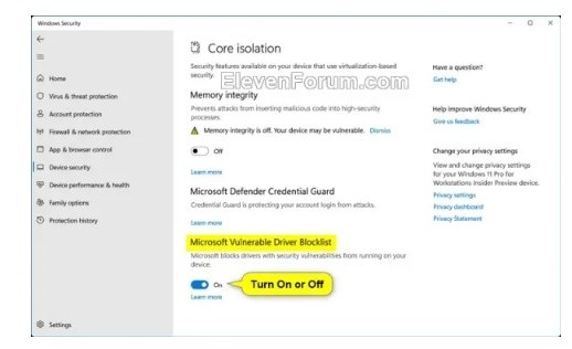具体操作就是:打开Windows安全中心,点击左侧的设备安全,然后单击/点击右侧的核心隔离详细信息链接。打开VulnerableDriverBlocklist。