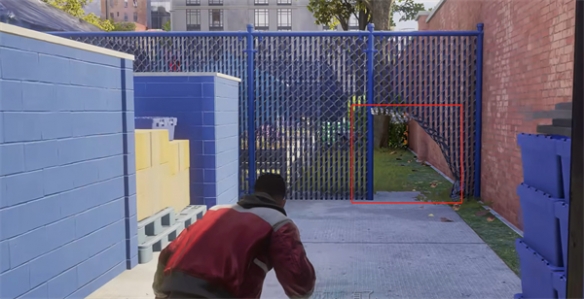2. 然后从一个关上一半门的仓库缝隙进去,能看见破洞的铁丝网,同时可以听见校长的对话。