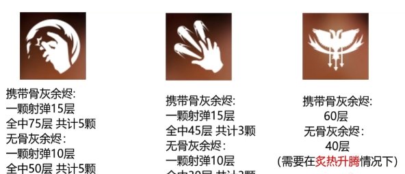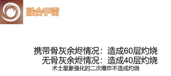 骨灰余烬:吃雷进炽热升腾,扔雷接凤凰俯冲,俯冲落地时灼烧配合融合雷第一段灼烧可以直接点燃目标,优先携带。