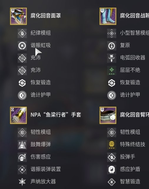 配置1衍生配置①:如果RAID中使用配置1,需要输出BOSS阶段前进行配置切换,切换后的配置模组参考如下,汇编器+流明,切完后插火中能给高尚弹药,然后对友军腰射进行35%增伤。(也可以衍生出月鞋的配置,1号位任意白蛋,脚换成月鞋,模组不变)