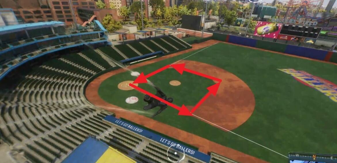 找到棒球场后,如果不懂棒球规则的话,可以沿着下图红色箭头跑一圈,就可以了。