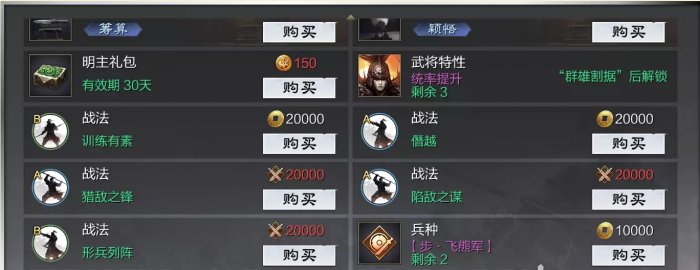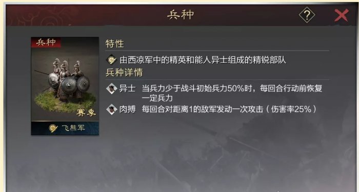 2.市井——赛季里有一些专有的战法和特性,比如可以降0.5C的战法「训练有素」,比如有提升武将属性的属性成长的「武将特性」,比如步兵兵种「飞熊兵」等。