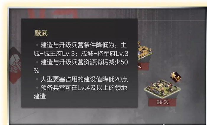 1.董卓5000名望时会解锁一个政策「黩武」,自动解锁的哈。效果上可以让玩家3本升兵营。