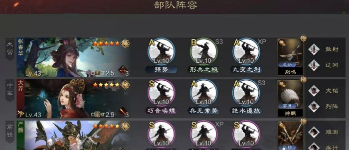 没用【九变】之前,用的是【步步】,打法刀没问题,但是打不了菜刀,特别是瓒刀。带了【九变】后,春华是全速,还加速度宝物,可以快过狗刀荀彧和张绣,形兵加士气【强势】能接近50%的瞬发,可以封住关羽张秀,法刀的输出大营。