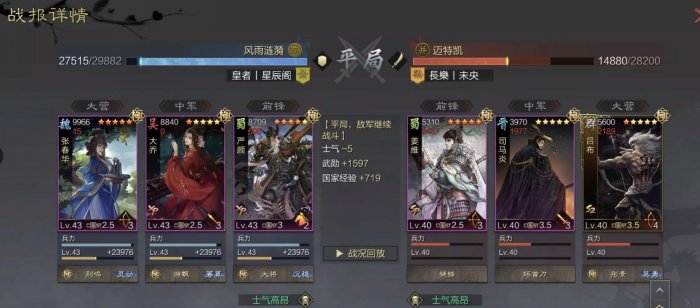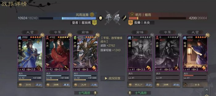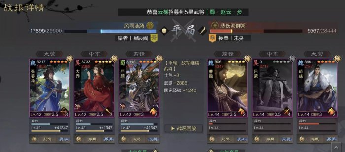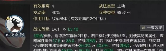 新战法【九变】有点复杂,它发动率尚可,如果敌方被控制就降对方属性,如果被持续性伤害则使其挨打时增伤,不挨打则被怯战或动摇,上述效果完了后还能给对方一个小伤害攻击。