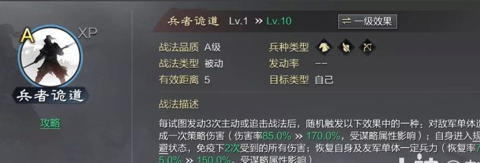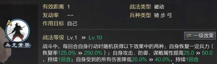 【兵者】是被动战法,优先级很高,看战法效果有伤害、规避、恢复其中一种,和【兵无】的恢复、加属性、降伤,三选二的类型有点像。