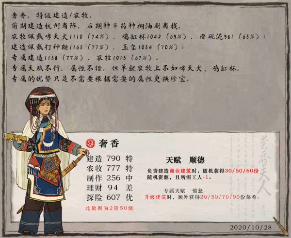 满级属性:建造790,农牧777,制作246,理财94,探险607
