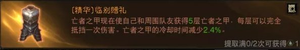 在这里死灵必须做辅助位,因为死灵拥有全职业唯一一个赖皮技能,免疫伤害,死灵的衣服给到队友亡者之甲,骨甲挡5次伤害(注意不要被点燃重点等等状态蹭掉了,注意自己走位)同时护肩还可以让亡者之甲给攻速。看完BOSS的破甲相信没有玩家会质疑BOSS打你的输出,所以只有活下来才能谈输出。