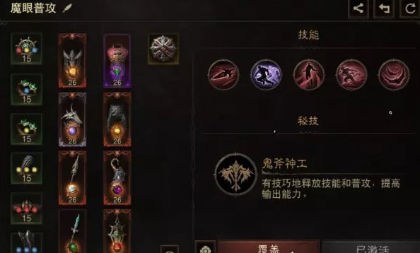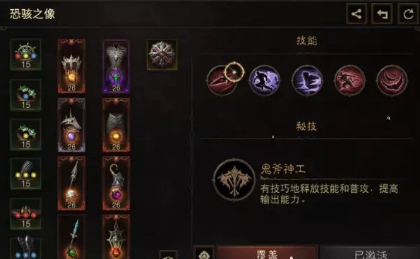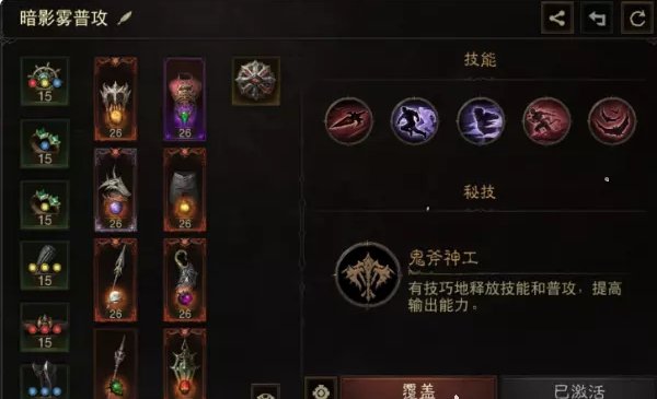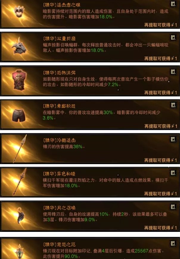 这套精华是暗影雾的头部增伤裤子增加攻速,蝙蝠普攻肩膀,恐怖消弭衣服,普攻锋刃+副手锋刃加攻速以及4层引爆。这样没有引渡吞噬和无畏挑击会空缺出一个主手精华,如果你愿意可以带横扫千军并且带上异色和睦多一个Dot点燃状态。