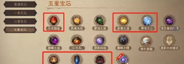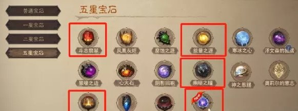 5星推荐斗志翡翠、能量之源、幽暗之瞳、星火碎片、虚空火花,这5个都是伤害类的5星输出宝石,斗志能量属于增伤类,星火、虚空、幽暗属于技能类。如果你共鸣不高,哪怕做3/5星的宝石也是很不错的(2/5星和3/5星价格差不多)再搭配2星宝石即可。