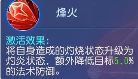 给目标灼烧特地使的技能。灼炎除了给急火套更广的作用面。如果这个技能也受经脉烽火影响的话,他也能给队伍的其他的法术单位增加输出能力
