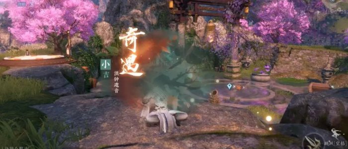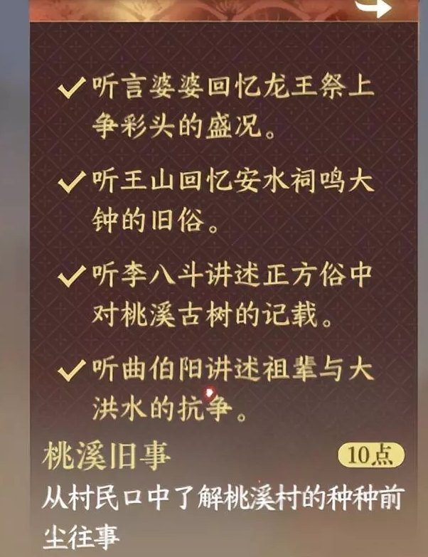 【听王山回忆安水祠鸣大钟的旧俗】:这个是奇遇【洪钟追音】奇遇完成的,奇遇需要先完成王山的探索,在桃溪村956,1883使用火系技能点燃王山面前的火堆即可,开过这里箱子的可以到1382,1292这里演奏触发奇遇,如果奇遇做过但是成就没有完成的可以梦回。