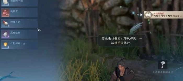 无论正常做还是梦回都需要准备好【桃花雪】,在桃溪村酒铺购买,后续跟着任务走即可达成成就,对话选项随便选,同样是不能跳过对话。