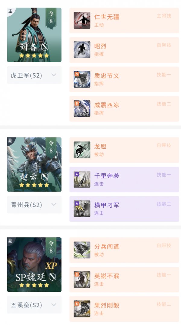 该阵容中SP诸葛亮的定位偏向辅助,利用其自带技能的新机制,能让他与SP太史慈在进攻时造成更高的伤害。若考虑让SP诸葛亮担任核心,可以沿用以往的指挥增伤配置,替换一名连击或主动副将输出即可。
