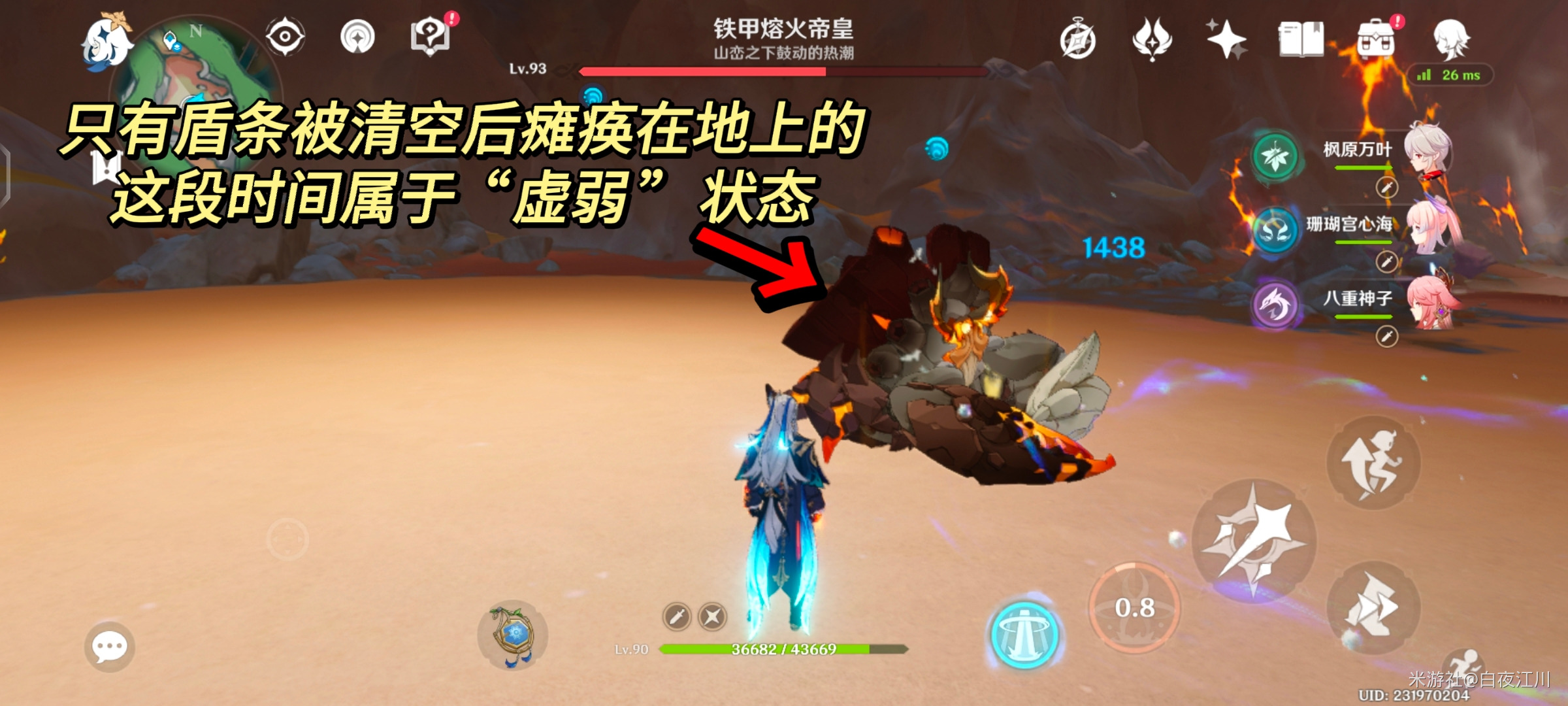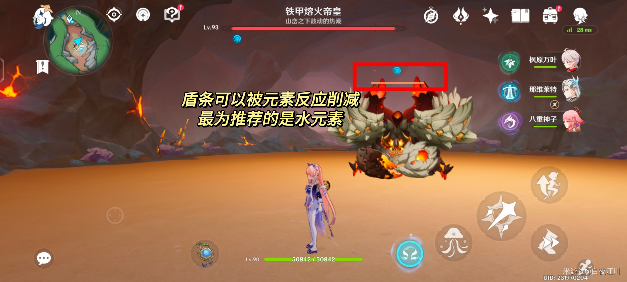 在挑战大世界boss「铁甲熔火帝皇」的时候,它的角上会出现一个红色的火元素盾条。这个盾条可以通过元素反应进行削减,效率最高的是水元素。