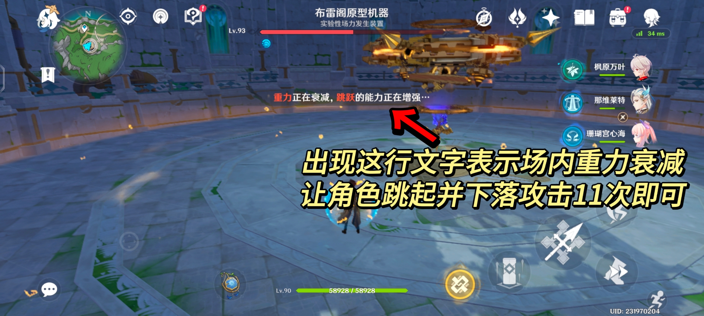 在与大世界boss「实验性场力发生装置」的战斗中,快速压低它的血量或者等待一会,它会移动到场地中央,当出现了图中所示文字提示后,场地内的重力会发生衰减,角色的跳跃能力也会大幅提高。