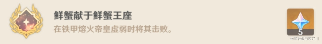 我们需要做的就是将盾条清空,使boss瘫痪,陷入虚弱状态,并在此状态下击败boss。成功后即可获得成就「鲜蟹献于鲜蟹王座」