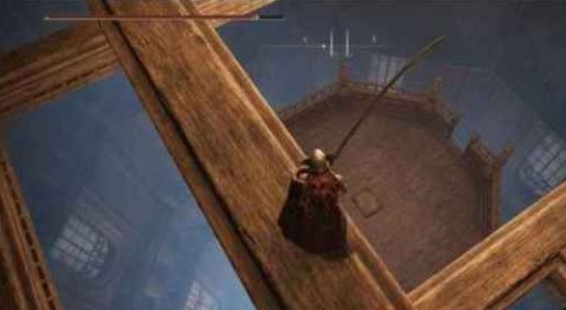 跳下去后,我们找一个合适的位置跳到木头横梁上