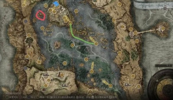 打完恶兆和葛瑞克出史东威城到达红圈(圆圈里面有地图请找一下)内的绿线开头的赐福,先点亮然后召唤灵马,按照绿线走绿线尽头!路上应该有个地图,还有一个水母盾记得找找。点亮绿线终点。那个蓝色的圈就是我们后期要去的月光祭盘