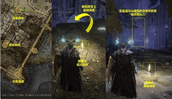 打完之前按照上面的照片走,打败仿身泪滴后一路前行找到赐福点“祖灵森林”。在“祖灵森林”赐福点向前跳到屋顶上,探索诺克隆恩剩下的区域。这片区域几乎就是一条路走到底,并不复杂。找到赐福点“黑夜神域”,在该赐福点所在街道的尽头,可以找到关键的东西道具“猎杀指头刀”。