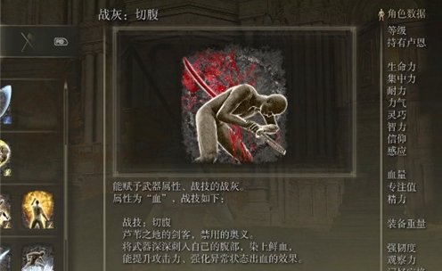 能提高武器的攻击能力,增强异常出血的效果; 切腹战灰只能用于剑类武器和可以突刺的长柄武器,不能用于小型和特大型武器; 手持切腹战灰的武器会使出血效果翻倍,基本上刀刀都会出血。