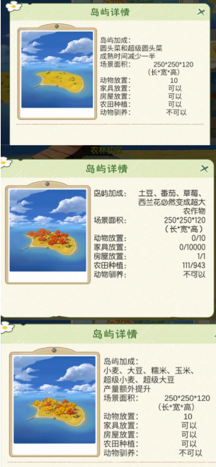 需要注意的是,秋之岛分为普通“秋之岛”、“林染·秋之岛”、“枫染·秋之岛”,解锁价格一样,不同的是,普通“秋之岛”没有植被;而其他两个秋之岛分别有对应的树木,并且每个岛屿的加成也是不一样的。