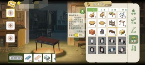 1、需要先将木工台进行升级,等级越高,可出售的家具种类越多,价格也会越高。