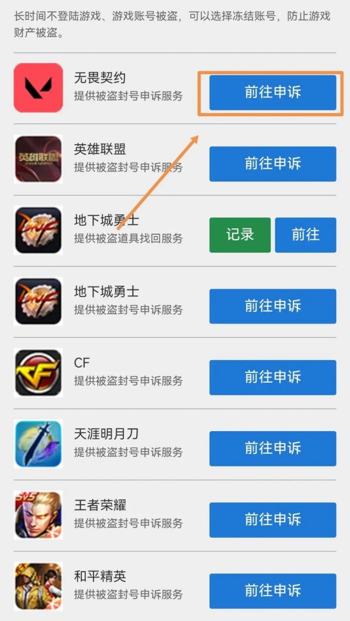 随后点击“被盗服务”,再在盗号申诉页面找到“无畏契约”,即可前往申诉。