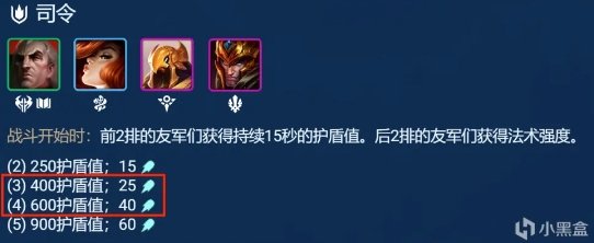 阵容的核心思路就是3/4司令羁绊+多装备+多c位,3/4司令羁绊的效果是站在棋盘前2排的棋子获得持续8秒400/600的护盾大幅度增加了前排的坦度,而后2排的棋子获得25/40法强,这样就大幅度提升了后排棋子的输出强度。